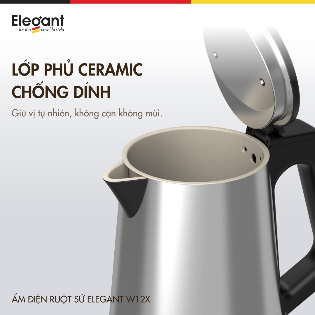 Khác với các dòng ấm inox giá rẻ, Elegant HOT-W12 có lòng ấm tráng gốm 100%. Chất liệu này không chỉ chống bám cặn mà còn tuyệt đối không phát sinh chất độc hại ở nhiệt độ cao. Đặc biệt, ấm có khả năng giữ nhiệt tự nhiên lên đến hơn 4 giờ, giúp bạn luôn có nước nóng sẵn sàng mà không cần đun lại nhiều lần.