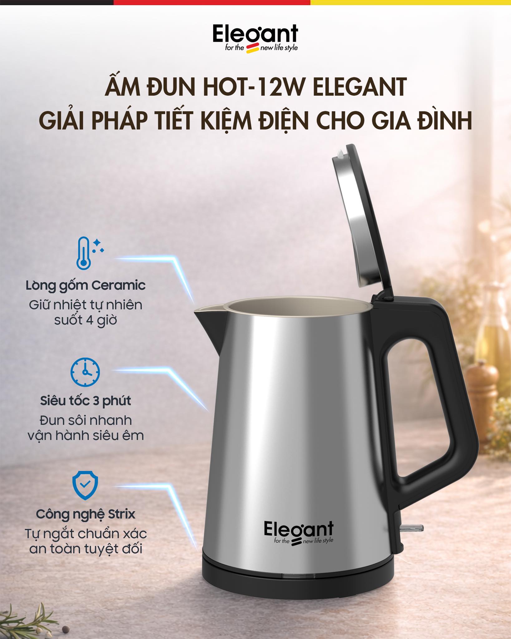 Bạn là người sành trà, cà phê hay đơn giản là quan tâm đến sức khỏe gia đình? Ấm điện lõi gốm Elegant HOT-W12 không chỉ là một thiết bị đun nước, mà là một bước tiến mới trong công nghệ gia dụng với chất liệu Ceramic cao cấp, giúp nước luôn thanh khiết và không bị bám mùi kim loại.